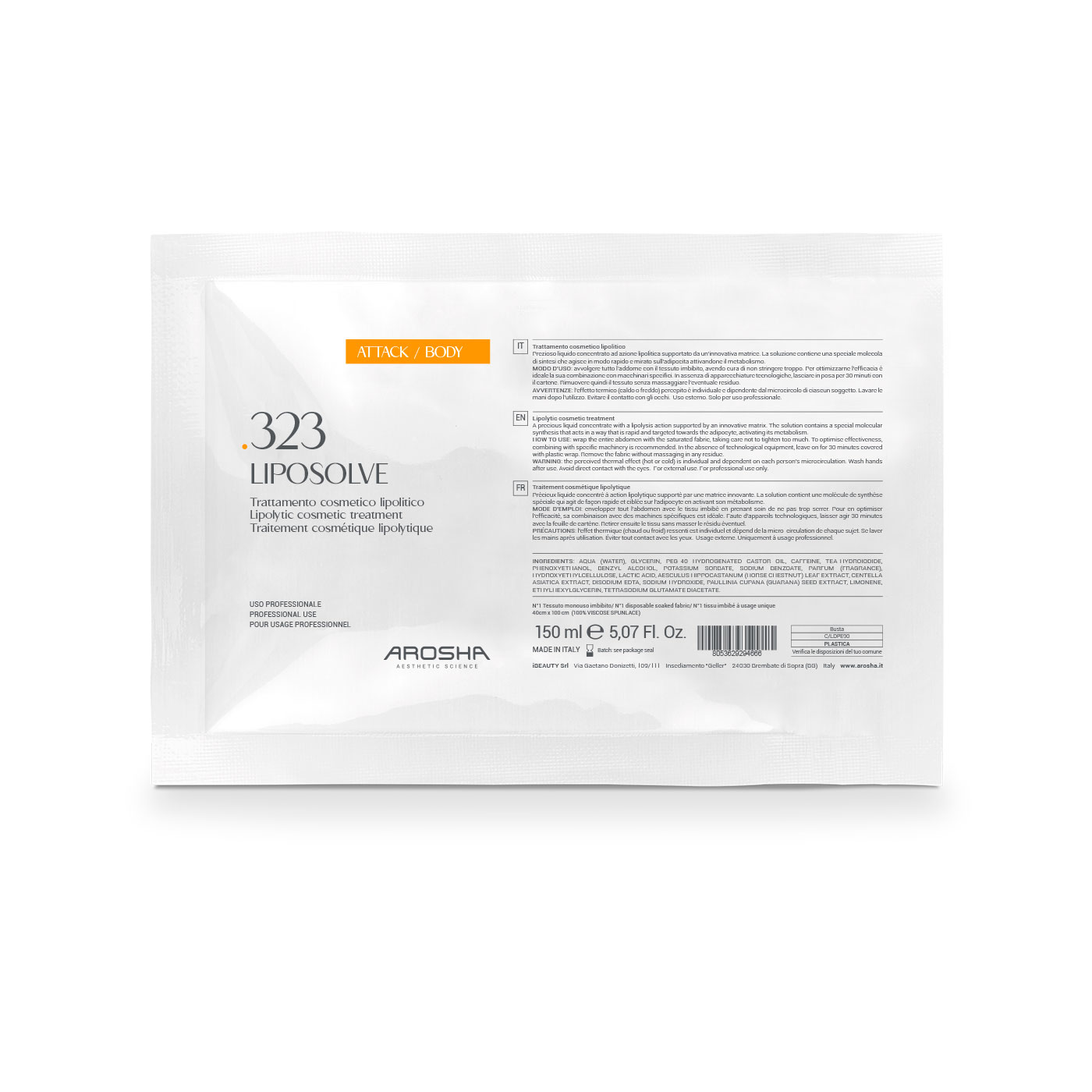 3 – ACTIVATION Separate the double bag (ADIPOSLIM + ADIPOLESS) according to the pre-cut line and proceed with the relative opening. Empty all the contents of the two bags (ADIPOSLIM + ADIPOLESS) into a suitable bowl and mix the two products until a single homogeneous gel is obtained. Wait a few seconds for the hot-cold system to activate. Apply the contents of the two bags to the area to be treated with a brush without massaging.