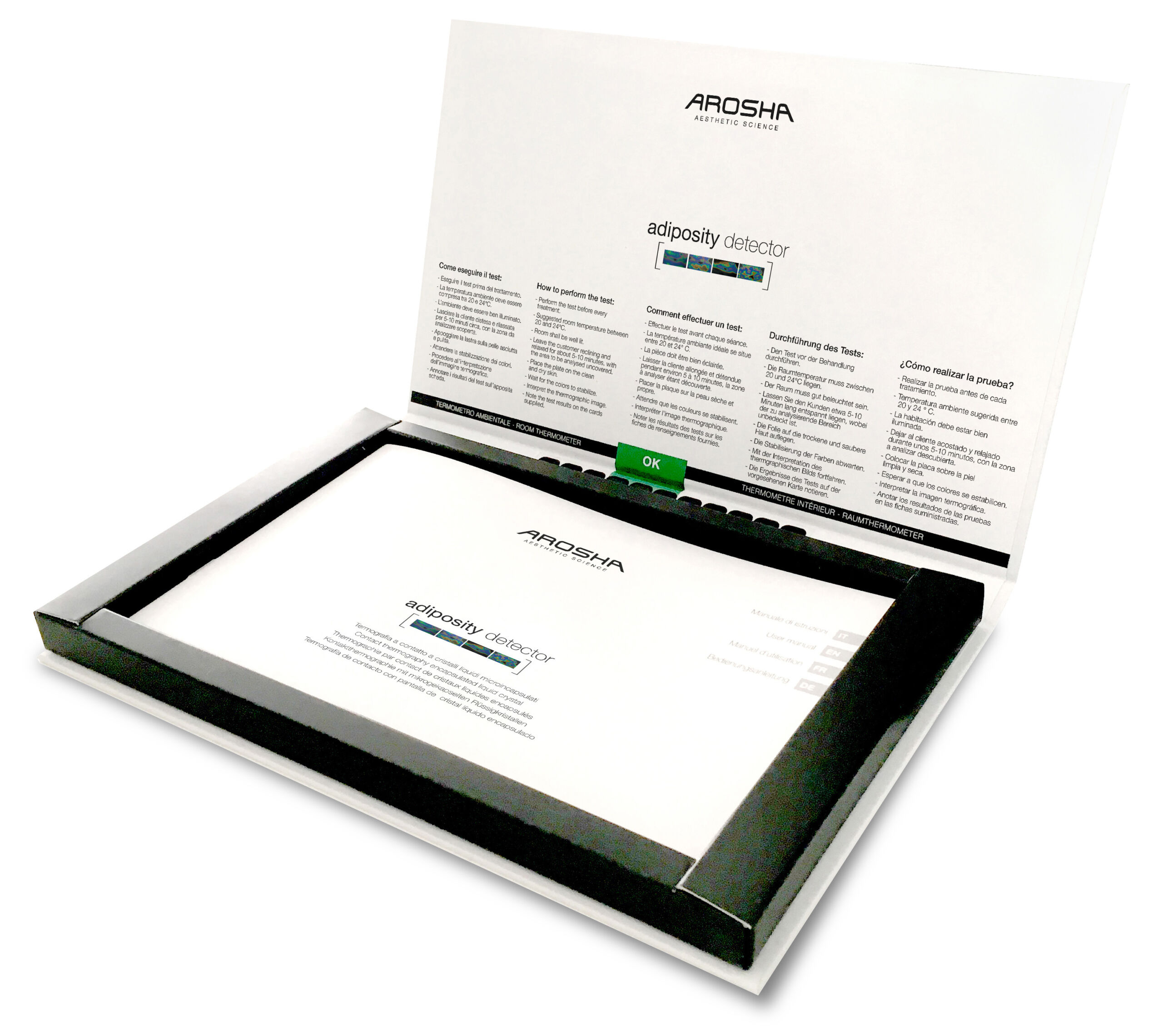Adiposity Detector is a contact thermography system protected by an international patent which allows to detect and classify the thermal signs of localized adiposity, to identify treatment areas which require greater attention and propose to a client all treatment possibilities.