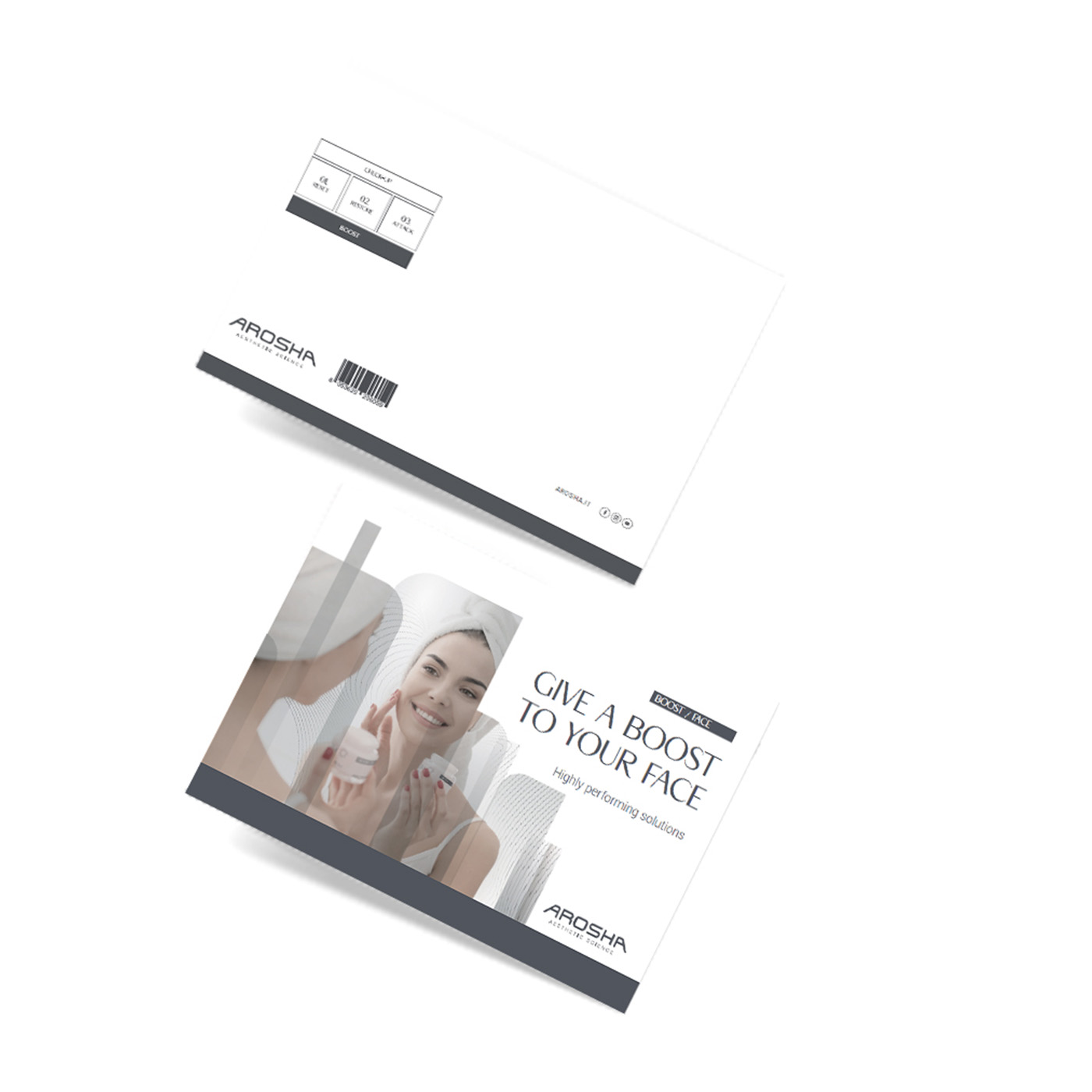 A professional, unique and distinctive Method. Combining science and technology, Arosha has developed a THREEPHASE strategy, applicable for face and body. RESET, RESTORE and ATTACK constantly supported by CHECK UP and BOOST to give result-oriented, synergistic action
